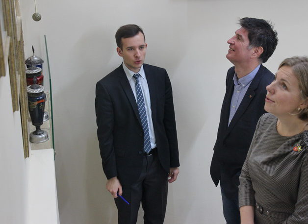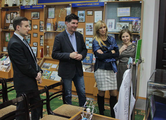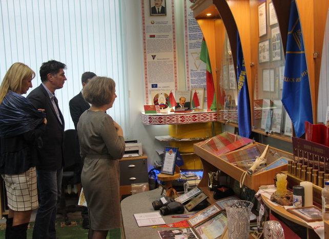Участие в конференции приняли представители научных библиотек из университетов таких государств как Беларусь, Россия, Украина, Польша, Молдова, Чехия и Индия. Во время конференции речь шла об организации библиотечной работы, инновации в области библиотечно-информационной деятельности, роли библиотек в составе высших учебных заведений в настоящее время. В рамках пребывания в университете гости отправились в путь по экскурсионному маршруту учебного корпуса № 1 «Золотое кольцо истории ГрГУ им. Я. Купалы». Заведующий музеем истории Николай Макареев и смотритель музея Никита Каранкевич ознакомили экскурсантов с историей научной библиотеки университета, подробно рассказали о каждой из галерейных и информационных экспозиций музейного комплекса, показали наиболее ценные для истории вуза документальные источники и экспонаты. Отзыв о приёме делегации в Купаловском университете от имени всех директоров научных библиотек университетов из вышеназванных стран оставил в книге почётных гостей Галиев Айдар Рашитович из города Москва. |