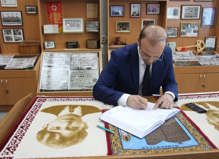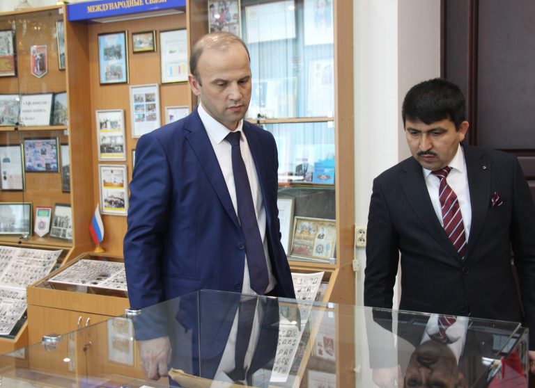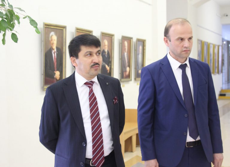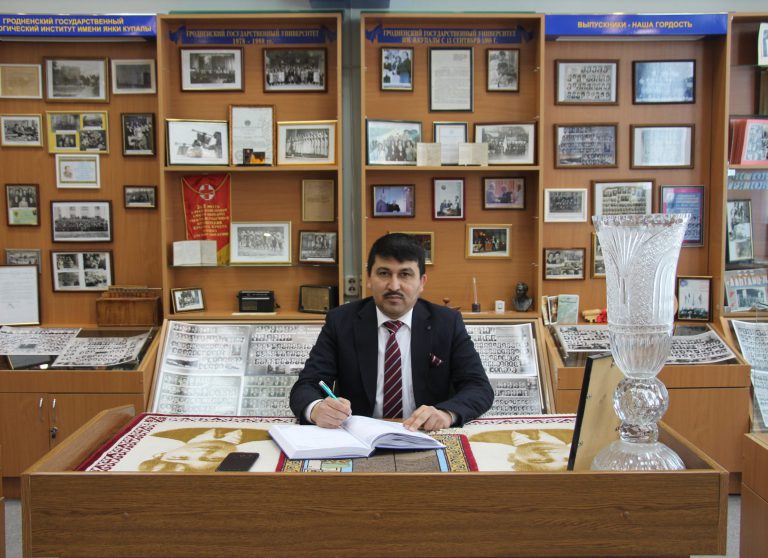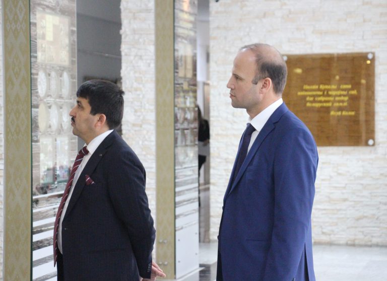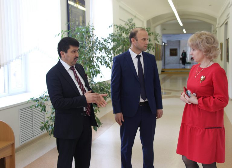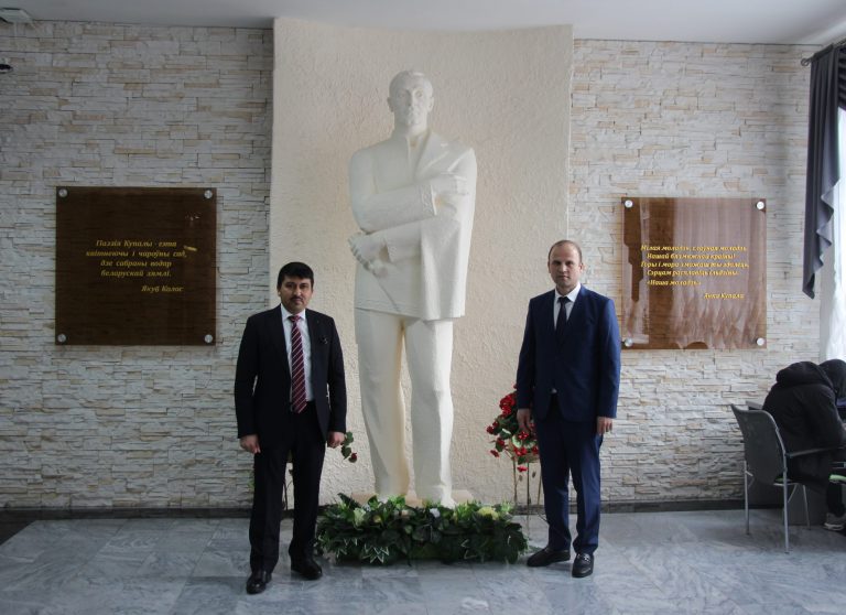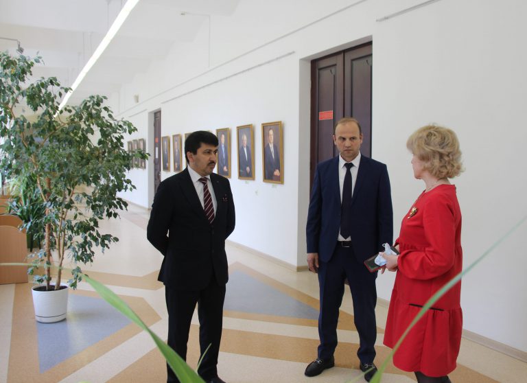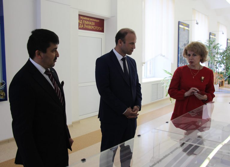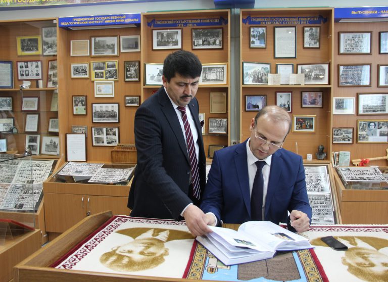 Экскурсия для делегации Ташкентского химико-технологического института Абдуллаева Алишера Шоназаровича, декана факультета химической технологии топлива и органических соединений и Шернаева Анвара Нормаматовича, начальника отдела по координации совместных образовательных программ в сотрудничестве с зарубежными образовательными учреждениями состоялась в главном корпусе университета с посещением галереи профессоров, галереи, посвященной Янке Купале, а также Музея истории развития ГрГУ имени Янки Купалы 22 февраля 2022 года. |